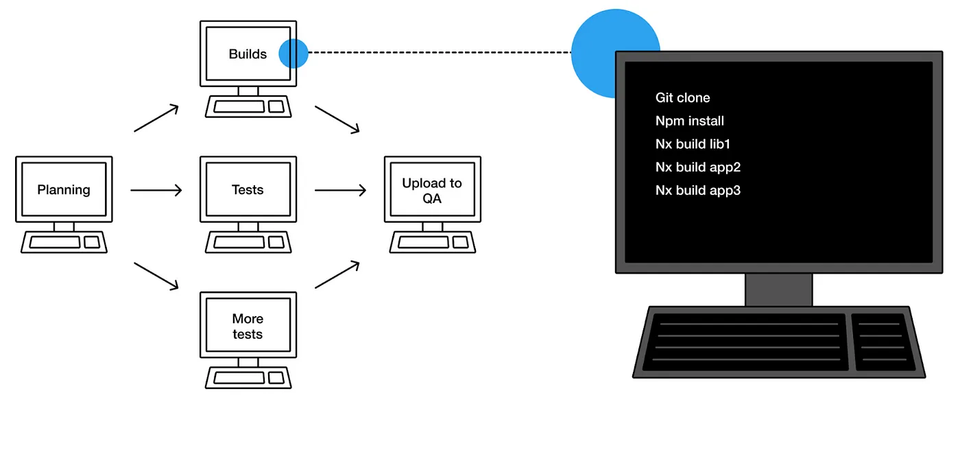 A traditional CI execution is a directed acyclic graph (DAG) of virtual machines (VMs). Each VM (often called a job) installs dependencies, restores NPM cache, and then runs the necessary steps to verify that, say, some tests pass.
